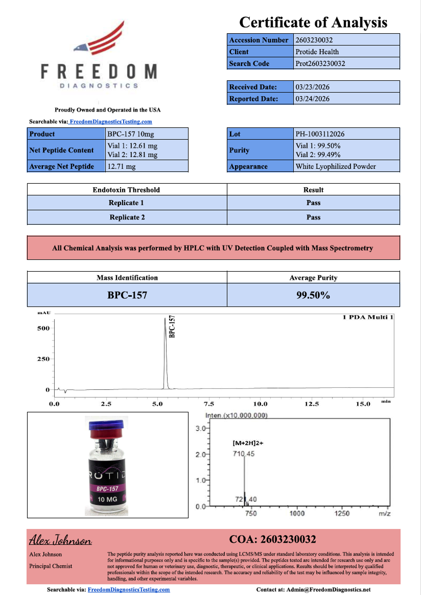 Legal Disclaimer: BPC-157 is sold by Protide Health for laboratory research purposes only. This product is not approved by the FDA for human consumption, medical use, or veterinary use. By completing a purchase, you verify that you are a qualified researcher and must comply with applicable local, state, and federal regulations. Please review our Terms & Conditions before purchasing.