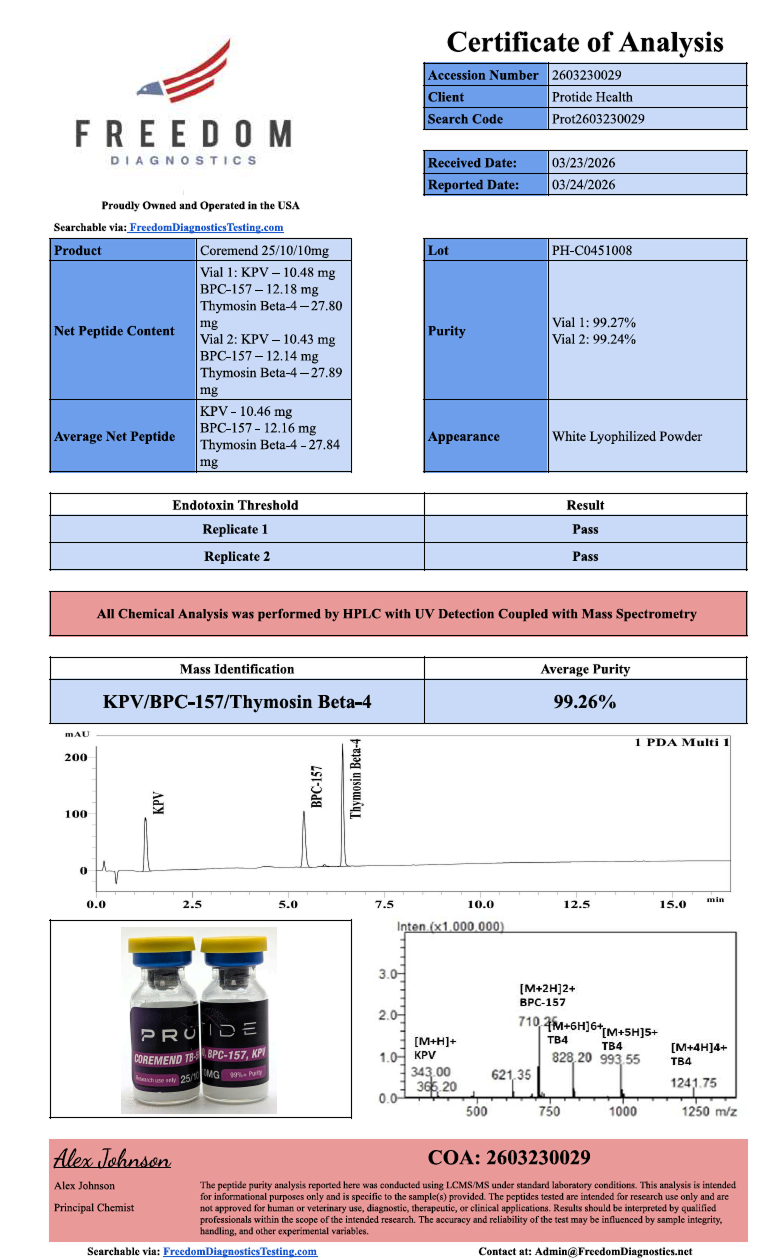| Product Contents | Coremend Blend: TB-500 (25mg) / BPC-157 (10mg) / KPV (10mg) Lyophilized Powder (99% purity) in 3mL vial. |
