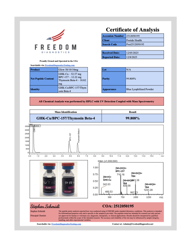 The information provided in this article is for research purposes only. The GLOW Peptide Blend (GHK-Cu, BPC-157, TB-500) is not approved by the U.S. Food and Drug Administration (FDA) or any regulatory authority for human consumption or therapeutic use. It is intended solely for investigational use in controlled laboratory settings by qualified researchers. Protide Health does not endorse or promote the use of the GLOW Peptide Blend in humans or animals outside of approved research protocols. Researchers must comply with all applicable local, state, and federal regulations, including obtaining necessary approvals for experimental use. Consult with regulatory authorities before initiating any research involving the GLOW Peptide Blend.
