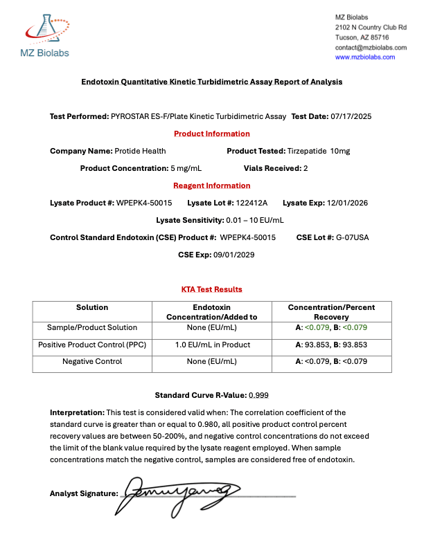 Each 10mg vial from Protide Health is supplied as a high-purity, lyophilized powder for controlled laboratory reconstitution. To ensure precise protocol design, investigators can utilize the peptide dosage calculator.