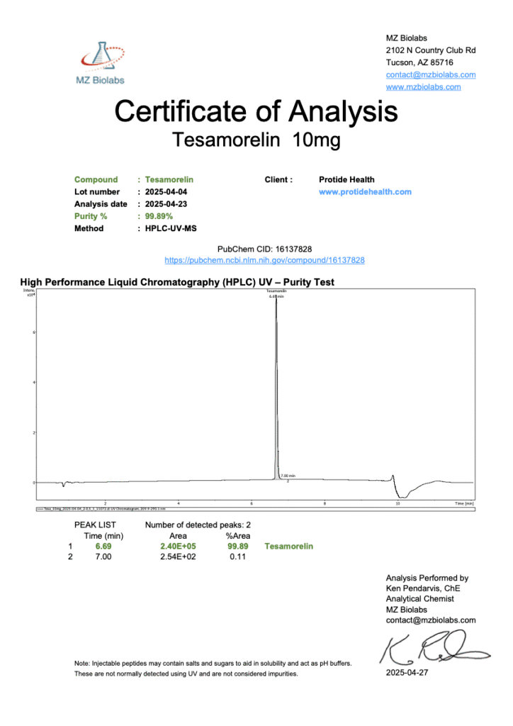 The information provided in this article is for research purposes only. Tesamorelin is not approved by the U.S. Food and Drug Administration (FDA) for human consumption or therapeutic use outside of specific indications (e.g., HIV-associated lipodystrophy). It is intended solely for investigational use in controlled laboratory settings by qualified researchers. Protide Health does not endorse or promote the use of Tesamorelin in humans or animals outside of approved research protocols. Researchers must comply with all applicable local, state, and federal regulations, including obtaining necessary approvals for experimental use. Consult with regulatory authorities before initiating any research involving Tesamorelin.